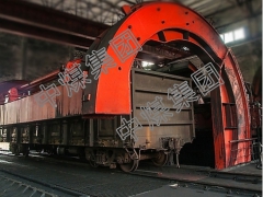 C型翻车机采用“C”型端盘,为箱形截面结构,利用其抗弯、抗扭的优点弥补C型结构的不足。使用箱型梁联接,固定平台,液压压车,液压靠车,消除了对车辆的冲击,有效释放车辆弹簧能量,回转更加平稳。结构简单、轻巧,驱动功率小。液压站可采用机上式和地面式两种。翻车效率高、操作简单,整个过程可实现全自动化。适用翻卸车辆的范围广,并设计出适应C80的“C”型翻车机。适合配备重车调车机系统。回转式双车翻车机主要由端盘、托车梁、靠车梁、压车机构、靠车机构、托辊装置、驱动装置及液压系统等组成。